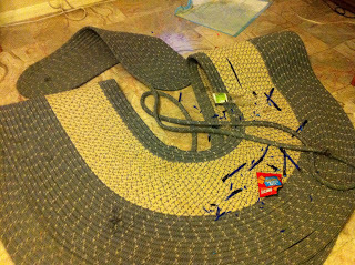 This is what happens when puppy is bored and we're two hours late for her dinner. DOH! (The carpet might not be totally her fault. We'd hosed it down and dried it outside for a couple of days, so maybe a string snapped.) The whole packet of plastic pencils though, totally her.