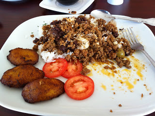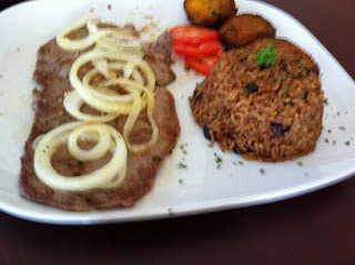 John had Bistec Encebollado. They call it something else but I grew up with this name and can't recall theirs. (Doh!) Steak and onions, premixed black beans and rice, tomatoes, and friend plantains.