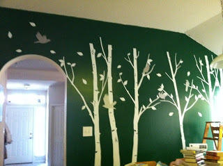 Kids are helping trying to spiffy up the house a little. The trees and birds came out great! Though the kids said the trees were a major pain to put up. Heh heh. (And yeah, those books there? Part of my TBR pile. Heh heh)