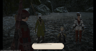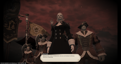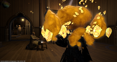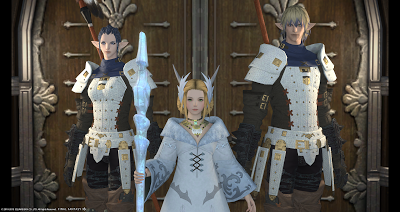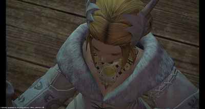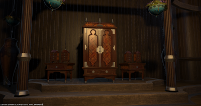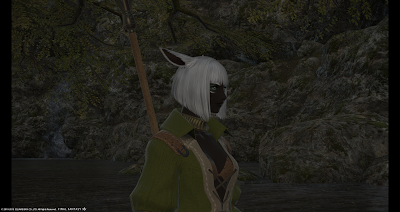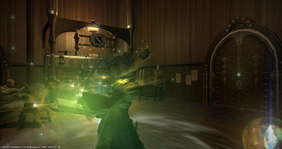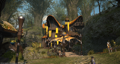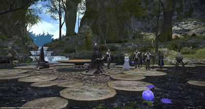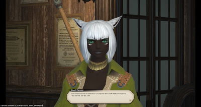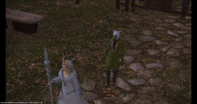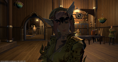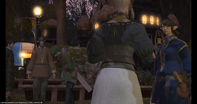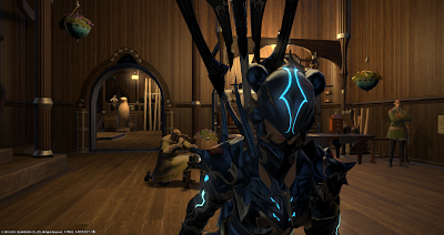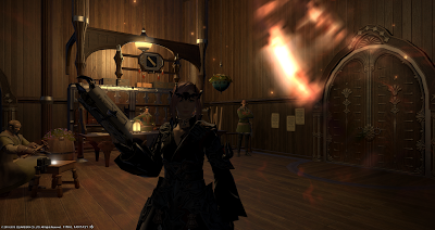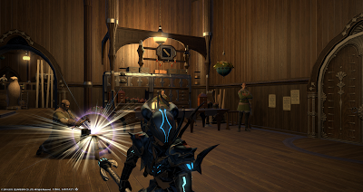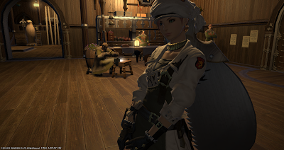 This is inside the Carpenters Guild. I got a visit from one of our Free Company (player guild) peeps. In FFXIV you can have multiple skills in player types, gathering, and crafting. You compile different clothes/armor sets for those classes and can save each individually. A very cool thing, but one I didn't know about when she did this! lol.
