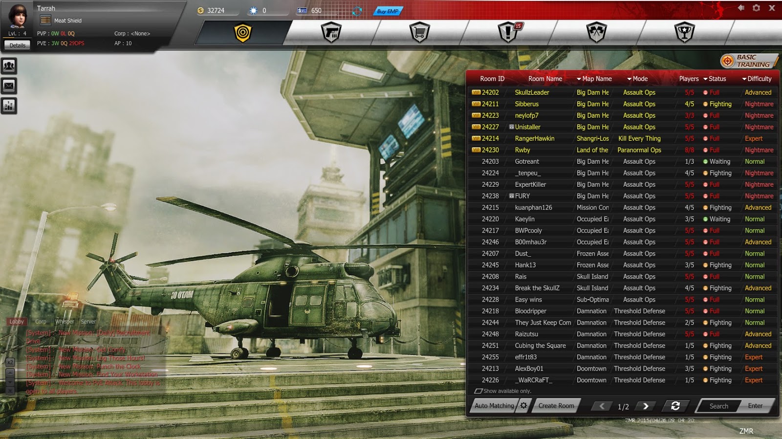 Lobby of the game where you can see what rooms are open, inventory, upgrades, etc.