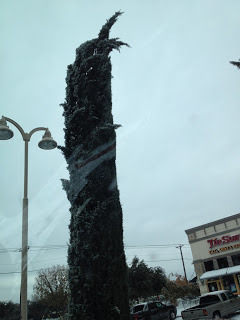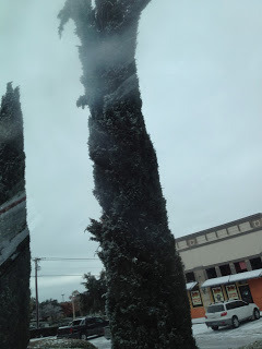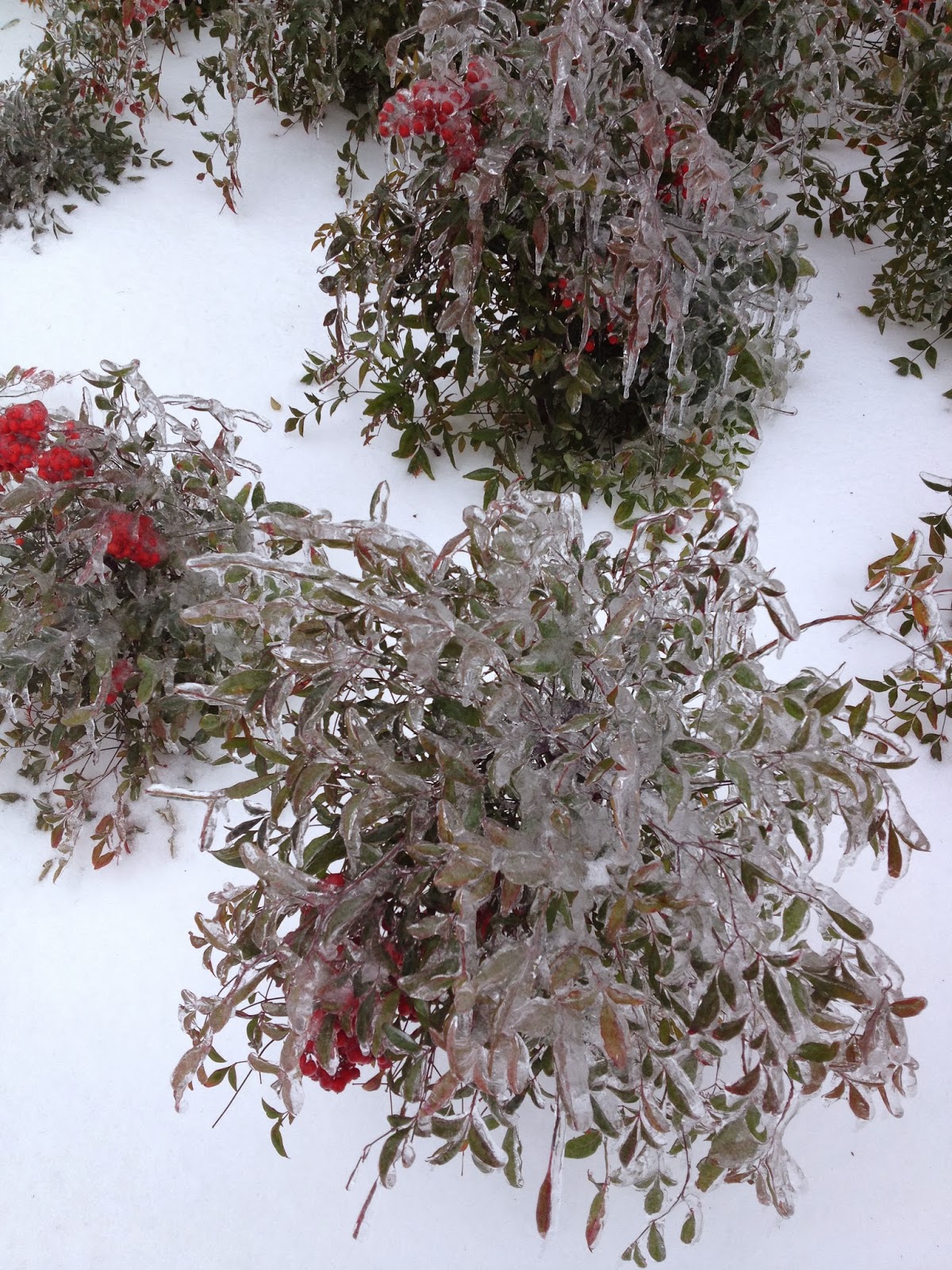 Lots and lots of ice covered bushes and leaves. I think a lot of plants won't survive this. Downed power lines and tree branches from too much ice weight.