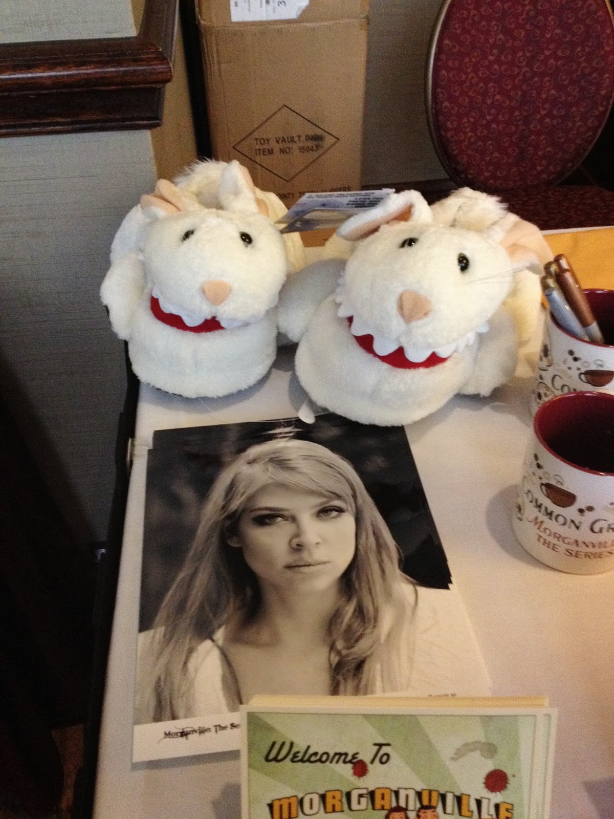 Common Grounds Coffee mugs, pics of Amber Benson (She's playing Amelie!) and a pair of Myrnin's Bunny Slippers. Bwahahahaha!~