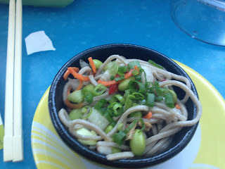 Soba salad. They forgot to put any broth in it though. :( The plates are color coded to prices like in Japan. Can get pricy in a hurry though. Beware!) They also have 3 heated entrees for non-sushi peeps. Their inari and mochi were great~! The sushi itself, not so much. :( Neat experience if you've never done it though.