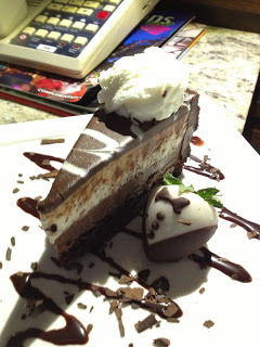 The cutest serving of cheesecake EVAH! They put a tuxedo on the strawberry. Isn't it cute?