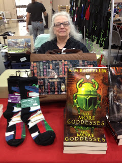 Liz Burton at the ZP table showing one of the newest YA books by Kim Baccellia and two of the gifts we were giving away during the con.