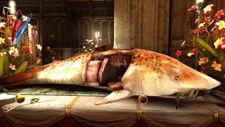 Yes, this is one of the dinner offerings. *shiver* The artists though went one step further, but it didn't come out in the pic. The open side there shimmers from the escaping heat of the cooked fish. Nice touch! (Not that it made this fish any more appetizing! lol)