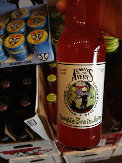Zombie Brain Juice - yes, you read that right - ZOMBIE BRAIN JUICE!Honestly they had all manner of insane candy, drinks, and gag packaging.