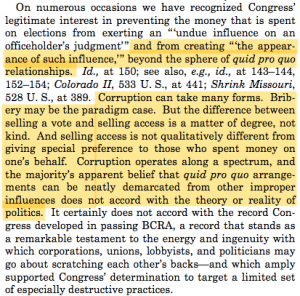 Another critical aspect of the right-wing majority argument in Citizens United was that actual corruption requires proof of a “quid pro quo” arrangement…basically, bribery….That, too, has become a core Clinton-supporting argument….Conversely, the once-beloved Citizens United dissent…was emphatic in its key claim: that there are many other forms of corruption brought about by corporate campaign expenditures….large amounts of corporate cash are almost inevitably corrupting, and certainly undermine trust in the political system, because of the many different ways…that corporations convert their expenditures into undue influence and access: