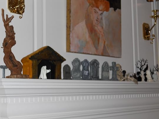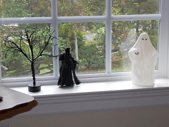 Cyn decorated the rest of the house with her fabulous Halloween toy collection, but I decorated the living room and dining room with spooky style tomb stones, ghosts, gargoyles, skeletons, and other long-leggity beasties.