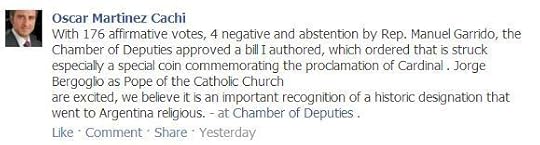 Argentinian lawmakers, proud of the first pope to hail from their country, may soon honor Pope Francis by putting his face on a coin.Argentina’s 480 million Catholics were thrilled by the announcement in March 2013 that then-Argentine Cardinal Jorge Mario Bergoglio, who served as archbishop of Buenos Aires, would become the new Pontiff.The tribute coin was first proposed in April by Rep. Oscar Cachi Martinez, and quickly gained support from congressional committees. The Argentinian congressman announced the successful vote yesterday on his Facebook page: