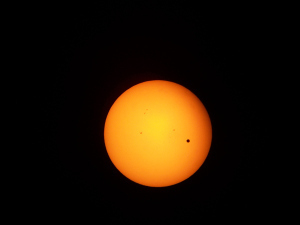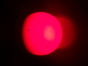 Here’s a photo I took of the transit of Venus using the same camera. What amazed me was that using this ordinary digital camera, not only could I see Venus (the dark spot on the right), but I could see sunspots (the lighter spots to the left).