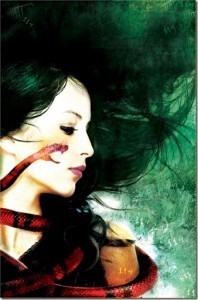 “Subject: An older teen girl’s face (seventeen or so) turned to the side so that we half see the profile. On one cheek is a snake birthmark, in a red colour. This snake becomes a real snake and wraps itself around her neck and down her unseen body. The face and the snake are the focus of the cover.