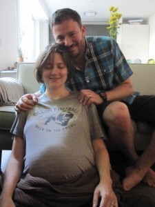 And an in-labor shot at home (early on, while I could still smile). Note my Tim Riggins-worn Friday Night Lights tee. It helped me be strong! And so did Dave, of course.