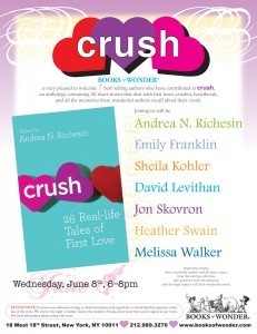 This week, I'm giving away another fantastic Contemp: Crush: 26 Real-life Tales of First Love, edited by Andrea N. Richesin. Actually, it's technically non-fiction, and there are some fantastic authors in the mix, including yours truly, plus David Levithan, Lauren Oliver, Jon Skovron, Emily Franklin… I could go on and on.
