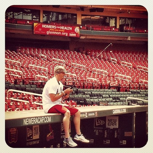 #Cardinals rookie Shelby Miller fishing off the dugout roof as part of a promotion.