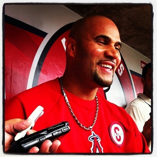 Albert Pujols, wearing Musial patch on BP pullover. July 2, 2013.