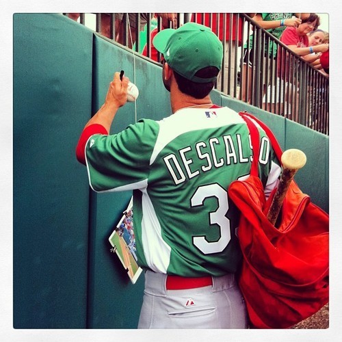 Green-clad Daniel Descalso returns a signed ball on St. Pat’s Day, on March 17.