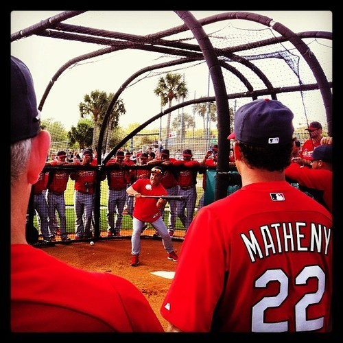 The whole #Cardinals roster, including manager Mike Matheny, watches as bench coach Mike Aldrete drops a bunt during a contest to name the best bunter in camp.