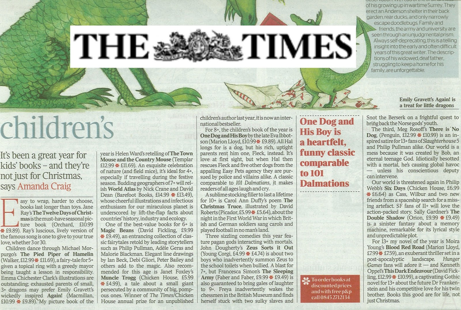 The children's critic for The Times of London, Amanda Craig, has made her annual pick of the best children's books -- and This Dark Endeavour makes the cut for the young adult category (13yrs + ) alongside Moira Young's acclaimed Blood Red Road:"Kenneth Oppel's This Dark Endeavour (David Fickling £12.99), a captivating gothic novel for 13+ about the future Dr Frankenstein and his competitive love for his twin brother. Books this good are for life, not just Christmas."