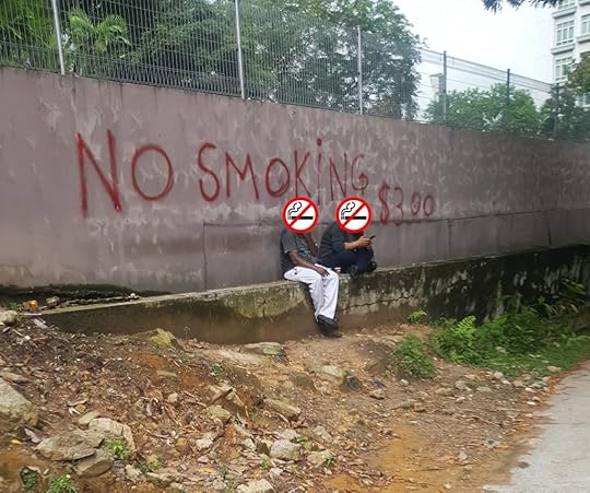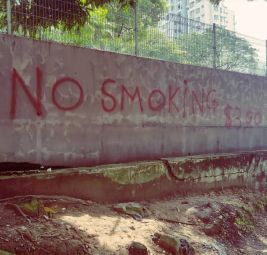 So what’s the issue? People are using the footpath and wall area as a place to smoke themselves stupid away from the neighbouring Tan Tock Seng Hospital. It’s annoying and passers-by have to inhale clouds of smoke they didn’t pay or wish for. People then proceed to throw butts on the ground and other remnants of their various vices. People sit under the grafitti, puffing away in a cancerous affront to the informal monetary warning. And what of TTSH? Can’t they provide their workers (and cancer patients) with an out-of-the-way smoking area far from innocent sidewalk shufflers’ lungs? It doesn’t appear so…