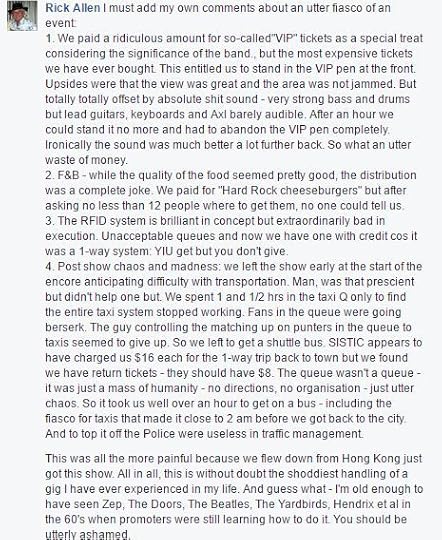 Looking at LAMC Productions’ Facebook page comments, I got away lightly. Many people queued hours for food only to find everything was sold out and they had no way to spend the money they had put on their RFID bracelets (LAMC have posted on their page that they are proud of bringing GnR here!! And then mentioned they will work on refunding the credit left on RFID bracelets). Ridiculous! It’s all summed up by this guy’s experience, VIP packages ranged from $1,038 to a staggering $2,063 for a lounge experience!!