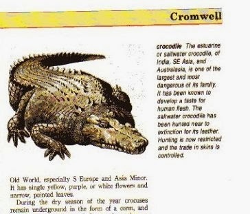 I suggested we might try, instead, to find out all about crocodiles, and showed her how we search for things in alphabetical order. We arrived at crocodiles and found a colour illustration of a large one lying down - a classic pose with belly spread out to the sides: