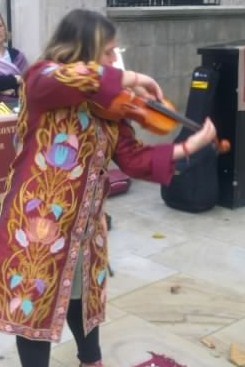 This is Lily Schlaen of Orquesta Sin Fronteras, playing opposite the entrance to Downing Street yesterday afternoon, in aid of Kashmiri human rights groups.Lily is a force of nature and her new orchestra, based in Teddington and including musicians from every nation and range of abilities - including disabilities - is an inspiration. http://www.facebook.com/pages/Orquesta-Sin-Fronteras/114135311943534