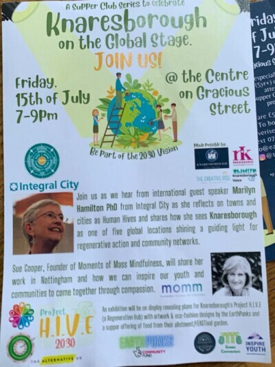 Marilyn admired Knaresborough’s strong energy for change – which she had witnessed with every engagement and stop about the city – virtually following the Integral City Maps. We saw in action the bio-psycho-cultural-systemic ase. The 4 Voices were all present in the evening gathering. Already they had been exploring the themes that citizens were keen to explore and develop – economy, education, transportation, tourism and many more. But more importantly the 4 Voices were already active in envisioning a new future for Knaresborough (as it becomes decoupled from Harrogate’s regional direction) – one that embraces its rich history and traditions, while recalibrating life for humans and nature – that offers the next generations hope and potential – Amanda calls that an adventure for Earth Punks!!