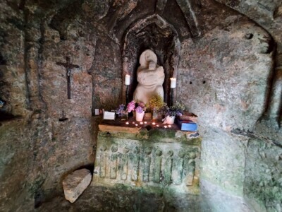 The local guides then walked us to the sacred Chapel of our Lady of the Crag – a grotto carved out of the sandstone crag (guarded by an imposing stone Knight) and holding a statue of Mary and the Babe – which we observed was visited by a steady flow of pilgrims.