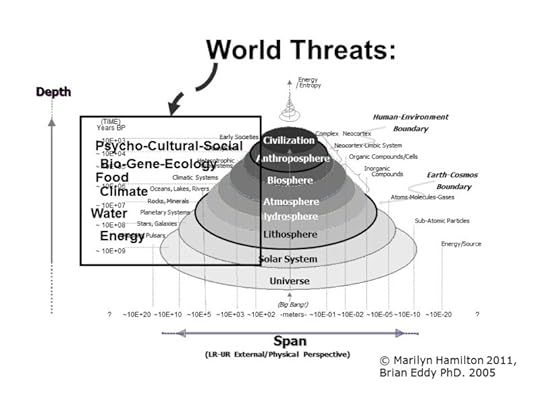 When we ponder this stratification of elements they challenge us to consider what would happen if any of them were threatened. I identified the threats related to the last six of these zones as related to Energy, Water, Climate, Food, Biogenetics and Psycho-Cultural-Social impacts as seen in Figure 2 (ibid).