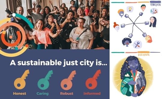 Research & Innovation : ( Inquiry ) Justice is hardwired into research & innovation projects on urban sustainability Economy : ( Social ) The economy benefits people and the environment Power : ( Culture, Evo ) Power dynamics are identified and dismantled for more equitable structures Responsibility : ( Inner ) City makers take responsibility and are held accountable Technology : ( Social, Navigating ) Digital tools can serve everyone Accessibility : ( Culture, Living, Eco ) Green is for everyone Nature : ( Eco, Emergent ) Nature creates living and breathing cities Diversity : ( Culture, Integral, 4 Voices) ) Inclusion starts by embracing diversity Solidarity : ( Culture, Inner ) Solidarity is fairness in action Adaptation : ( Emergent, Living ) Change is inevitable, and adaptation essential Regional : ( Eco, Living ) Regional integration makes cities stronger Participation : ( Culture, Meshworking ) Meaningful participation is empowering Art : ( Inner, Culture, Navigating ) Art creates a sense of belonging, and has the power to transform places Civil Society : ( 4 Voices, Culture ) Anybody can be a change-maker in their community Knowledge : ( Inquiry, Navigating, Eco ) Knowledge is owned and managed by the community Translocal : ( Map 2, 4+1 Voices ) Sharing local learning brings transformative change Finance : ( Social, Navigating ) We need new ways of fundingThe UrbanA videos for the keys are found here and here. Throughout the gatherings of UrbanA, vignettes were created by Barcelona-based graphic artist Carlotta Cataldi (find her on Instagram here).