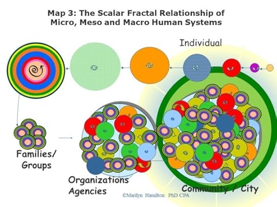 Map 3: Downscale and Upscale Doughnut Economics in the Integral CityIntegral City Map 3 reveals how capacities for action arise in the city from Individuals developing greater and greater complexity until they take systemic bio/psycho/cultural/social action (as revealed in Map 1). These fractal pattens enable high performance Groups and Teams that can influence Organizations and Agencies which in turn interact with the whole community/city in a holographic manner. All these scales actively self-organize and produce the structures (we see in Map 4) that downscale and upscale the application of the Doughnut to the flow of a regenerative city life.