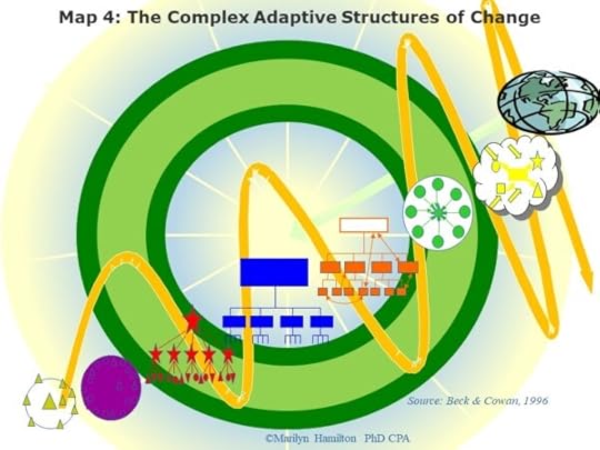 Map 4 (in the lower right of the 5 Map image above) shows the Complex, Adaptive Organizational (and Archetypal) Structures that have emerged across the history of human settlements from : family hearth, to clan gathering, to dominator hierarchy, to ordering bureaucracy, to strategic enterprise, to social safety networks, to systemic ecologies to global meshworks. (It should be noted that one structure is not better or worse than another – but represents the best “fit” to the contexting life conditions.) In the world’s large cosmopolitan cities all the organizational structures are alive and functioning within emerging urban contexts.