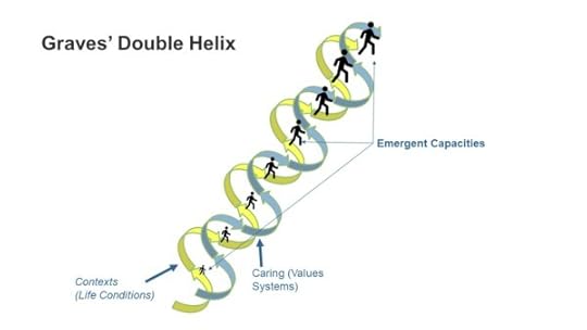 Clare Graves, the researcher behind Spiral Dynamics proposed that human capacity always emerged along a “double helix” where the context of life conditions, called forth the capacities that enabled the living human system to survive, adapt and regenerate (see Figure 1). His research indicated the emergence of 8 levels of complexity, but he proposed that the evolutionary pattern was a “never ending quest”. He suggested that each level of complexity would cycle through stages of “fitness” which we could call childhood/emergent, mature/coherent, old age/misaligned (see Ichak Adizes’ “Managing Corporate Lifecycles” for fuller explanation). Thus, Level 8 is not the final stage of human development, but like all prior stages will create the life conditions for the next level of complexity to emerge to respond to those life conditions.