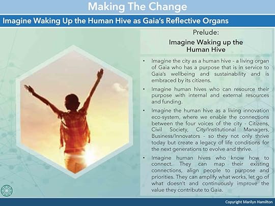 If Gaia is an evolutionary living system, then humans – and their cities, towns, villages and eco-villages are also alive. Hamilton framed the urban human habitats as Human Hives – sharing her learnings from the honeybees that we needed to include the 4 Voices of the city/eco-village if we are to bring the whole system to the table. Citizens, Civil Society/Third Sector, Civic Managers and Business/Innovators all have critical roles to play in responding to our planetary environmental challenges. And when we gather, we should always ask, “Who else should be here?”
