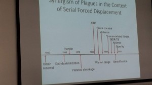 We heard next from Prof. Mindy Thompson Fullilove – who takes a bio-psycho-social approach to explore the synergism of place. She explored the experience of African Americans and how the city systems had victimized them through urban renewal policies (during McCarthyism) that wiped out the Left in cities – thus destroying the crux of relatedness that is the great goal of the city (harkening to Jane Jacobs). Fullilove pointed to the city of St. Louis where Google Earth can reveal from space the great divide of gentrification and poverty that separates the city.