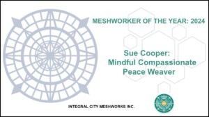 Meet Sue Cooper, Mindful, Compassionate, Peace Weaver: Integral City Meshworker 2024.Sue Cooper: Nurse. Ayurvedic Lifestyle Educator. Mindfulness and Meditation Teacher. She is continually amazed at all that this beautiful life has to offer. She receives guidance with Grace and serves community empowerment with Care, Compassion, Love and Aliveness.Sue Cooper is a graduate of Integral City Meshwork’s Beyond Resilient Course and has been taking her learnings to her home cities – Nottingham and Nottinghamshire – especially through her influence as a Living Cities Earth Co-Founder.