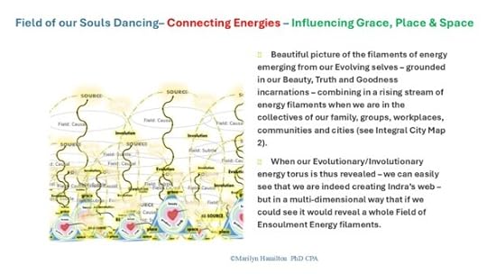After considering the power of these insights, all of sudden I had a beautiful picture of the filaments of energy emerging from our Evolving selves – grounded in our Beauty, Truth and Goodness incarnations – combining in a rising stream of energy filaments when we are in the collectives of our family, groups, workplaces, communities and cities (see Integral City Map 2).