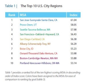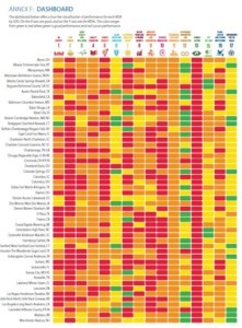 The report has an impressive traffic light dashboard reporting on all 17 goals for 100 US Cities (Metro Statistical Areas).