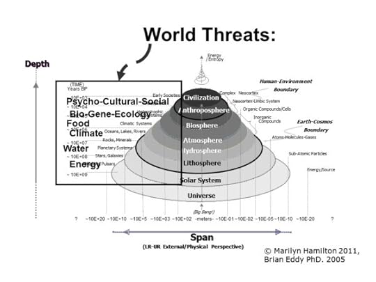 To provide the background for our observations (which are being incorporated into Chapter 15 of our Book 3 in the Integral City series) we introduce our graphic analysis of World Threats in terms of the 6 evolutionary levels contained in the Anthroposphere and Biosphere (based on Dr. Brian Eddy’s Integral Geographic analysis of world evolution).