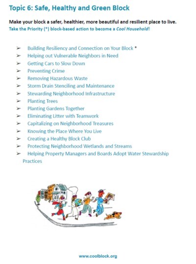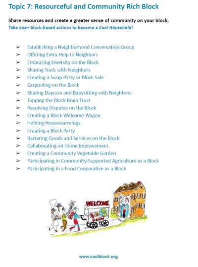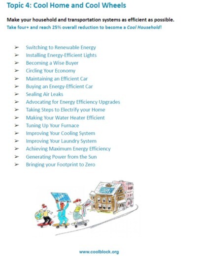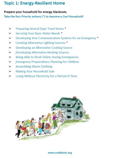 Look at your copy and you will see that most of the steps look like the Cool Blocks Topic 1, Priority Actions for the Energy-Resilient Home (see below). This list is common sense for emergency preparations for: Food, Water, Communications, Lighting, Cooking, Composting, Heating, Toilets, Children, Clothing, Safety and Electricity. It also helps us plan for the future in our Caring Community Circle.
