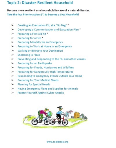Topic 2: Resilience With Cool Blocks WHERE Do We Go Next?Go back to your Household Emergency Resilience Planning booklet and you will see that more steps embrace the Cool Blocks Topic 2, Priority Actions for the Disaster Resilient Household. This list guides us to think through being ready for natural disasters, including: Preparing a Go Bag, First Aid, Communications, Preparing for Fire and Wildfires, Medical and Special Needs, Animal Protection and even Cyber Attacks.