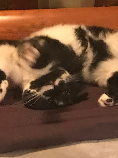 He and Oreo play (at least, I hope it's playing) tag every night. Down the stairs. Up the stairs. They sound like the brothers in A Christmas Story when they're racing to get up the stairs to go to bed on Christmas Eve. But Salem is a lover as well, and will wrap all around your legs. Usually when you're trying to walk.