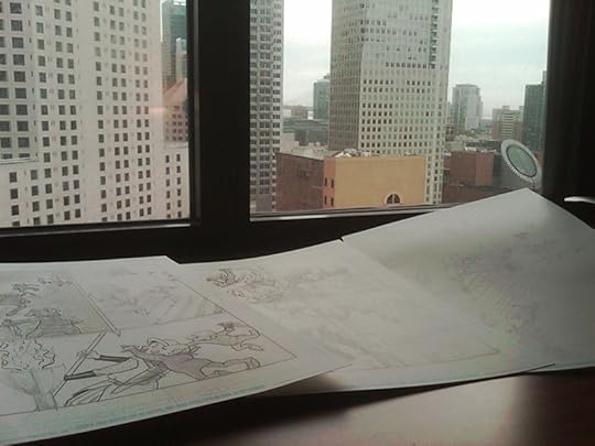 Below: a photo of Fables #107 pages in progress in my hotel room this summer. I don't remember which city. Do you recognize it?