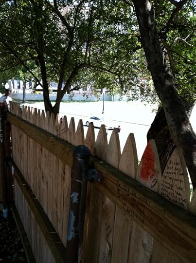 It amazes me that this fence is still here, as is the ugly, bare parking lot behind it. You can stand at this fence, make your shot, walk 10 paces to your car and drive away into an area that vehicles on Elm can't see or access. This is a perfect spot for a shooter. The conspiracy buffs who hang around this tourist trap area say there were two men with guns reportedly seen here, about 15 feet apart behind the fence. Their positions are marked on the fence in red paint, along with countless graffiti from visitors. If I step back and show you the back of the fence, you can see the red spray mark where one of the shooters [alledgedly] stood. The white car is over the kill shot X. Sorry this photo isn't balanced for light, again I have a cheap point and shoot.