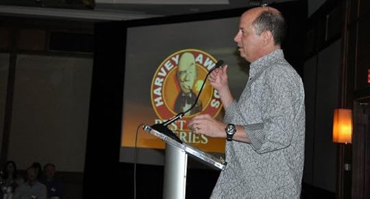 Photo of me ranting at the Harvey Awards. I tried begging for one but it didn't work. Next time, I'm trying cash and free Cheetos. This pic is an outrage by the way. I don't really look like this. Somebody's played a cruel photoshop trick. They made me look bald and fat, when in fact, I'm neither.