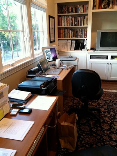 My studio: on the left are the north-facing windows and my computer desk. Robyn's desk is in the foreground. If your book is on that bookshelf, it means I love it.