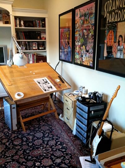 The right side of the room and my drawing board. Anything I drop on that dark busy rug disappears and is never found again. I'm pretty sure my innocence is down there somewhere.