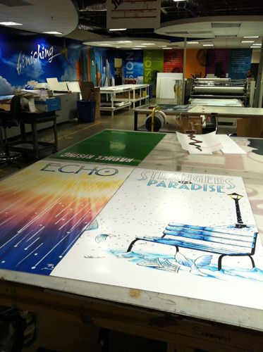 Here are oversized covers printed on vinyl for the display backdrop for our convention booth. Brian (my colorist) and I extracted the characters from the background, who were then printed separately, cut out and placed on top for a diorama effect. I spend a fair amount of time at printers over the course of a year.